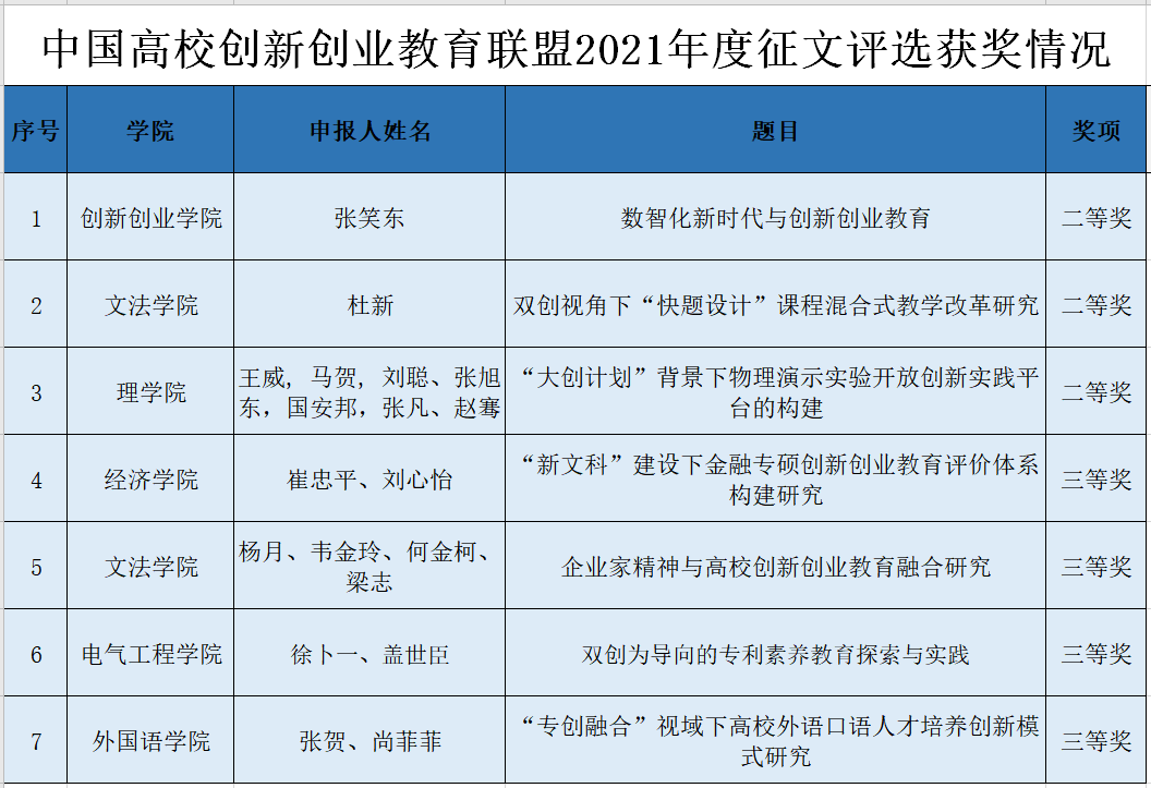 此次活动旨在系统梳理和总结对中国高校创新创业教育深化改革有重大影响的标志性研究成果,探寻中国高校创新创业教育深化改革的有效途径。在此次优秀成果征集评选中,我校推选的两门优秀课程分获一等奖和三等奖,两篇优秀论文分获二等奖和三等奖,优秀实践获二等奖2项、三等奖1项。在2021年度征文评选活动中,我校推选的论文获二等奖3篇(共25篇),三等奖4篇(共35篇)。